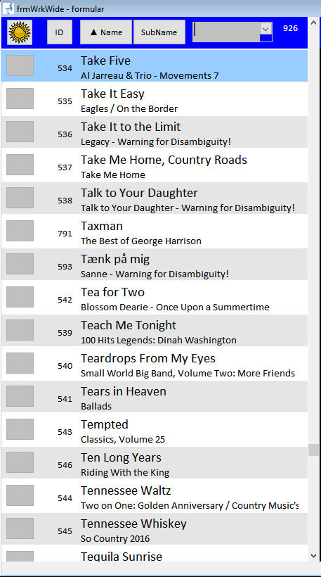 Many operations and buttons is common for the most Forms. On the lefts is a list of entities, taking up about one third of the screen (This is the List of Works), and on the right we have the Main form with the details: